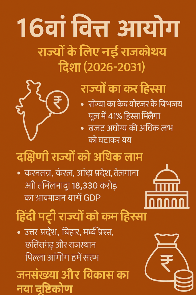 16वां वित्त आयोग भारत के राजकोषीय संघवाद में एक महत्वपूर्ण मोड़ है। यह न केवल राज्यों के कर हिस्से को निर्धारित करता है, बल्कि विकास के नए मानकों को भी स्थापित करता है। दक्षिणी राज्यों को अधिक लाभ और हिंदी पट्टी राज्यों को कम हिस्सा मिलना इस बात का संकेत है कि अब प्रदर्शन और योगदान को प्राथमिकता दी जा रही है।